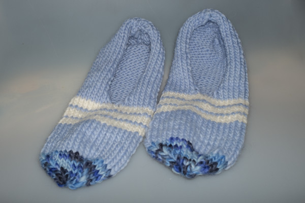Nun 3 Runden in weiß und 1 Runde in Blau stricken. Dies 3 x wiederholen Den Farbwechsel sollte man hinten vornehmen, also dort wo die Sohle ist.