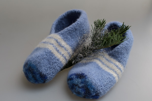 100 g Filzwolle in Hellblau und etwas Weiß und 50 g in Blau meliert, Rundstricknadel und Nadelspiel in Größe 8