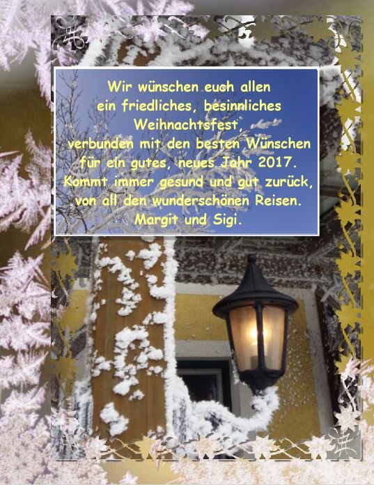 Auch wir möchten allen hier im Forum wünschen, dass es ein friedliches Weihnachtsfest wird und dass das neue Jahr tolle Reisen bringt.