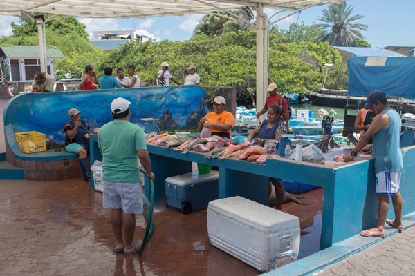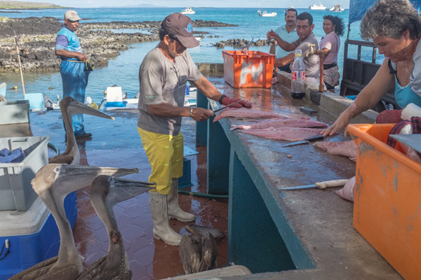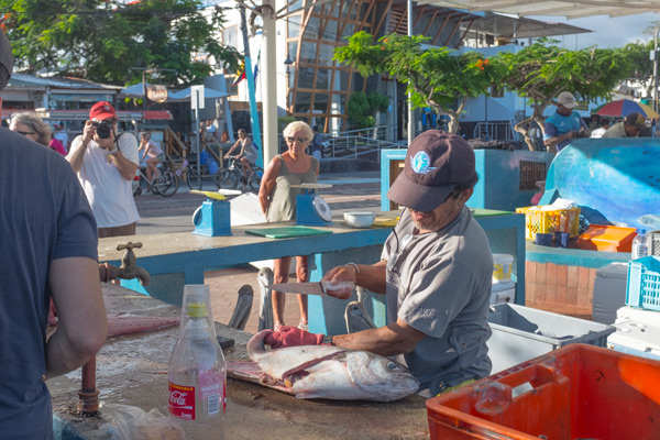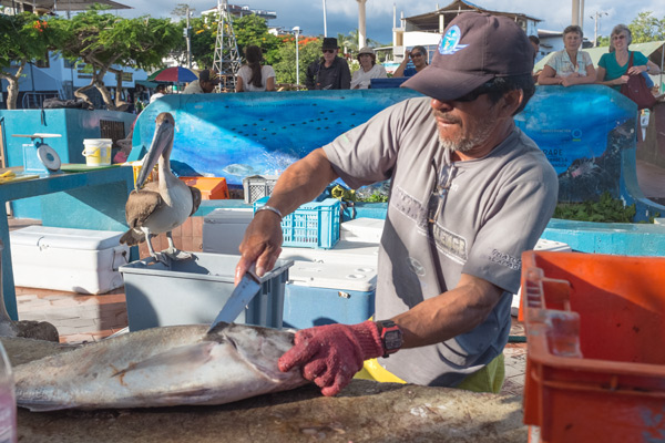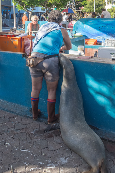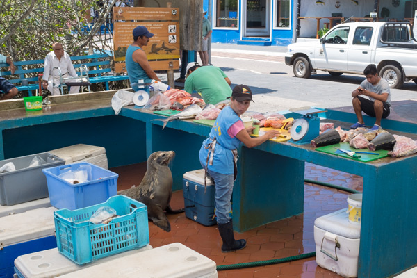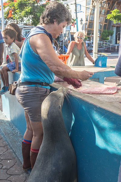Danach vergnügten wir uns wieder an dem kleinen Fischmarkt. Der Seelöwe steht bei der Fischersfrau, der Pelikan steht auf der Meerechse, der Fischer zerlegt einen großen Fisch ...