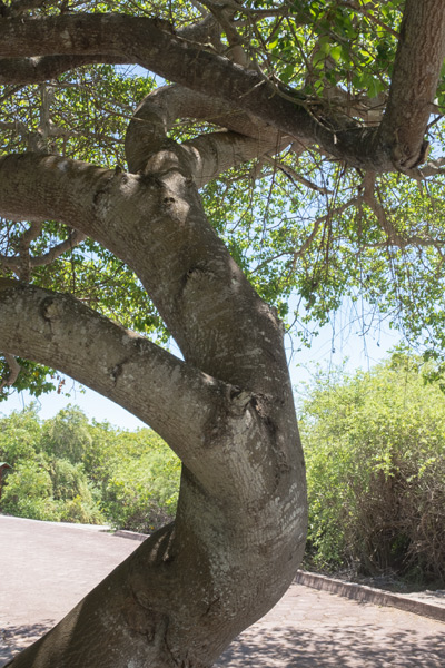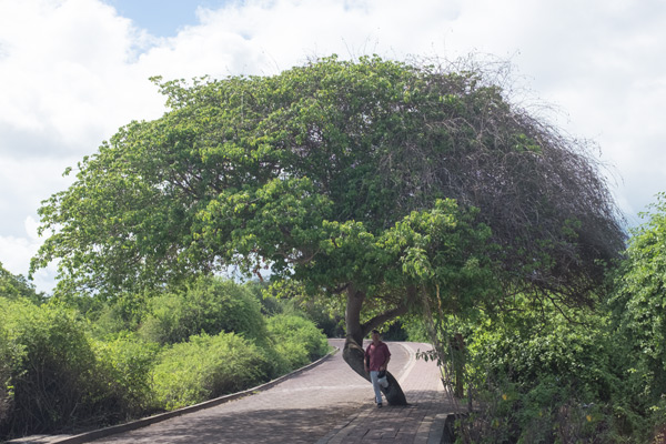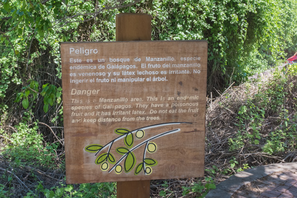 Auf dem Weg zur Station kommen wir wieder an einem großen Baum vorbei. Wieder sehen wir einen Warnhinweis. Es ist ein Manzanilla, einer der giftigsten Bäume der Welt. Wer die Frucht isst, stirbt, der Baum sondert bei Regen eine Flüssigkeit ab, die zu Blasenbildung auf der Haut führen. Das Gift wurde für tödliche Pfeile benutzt.