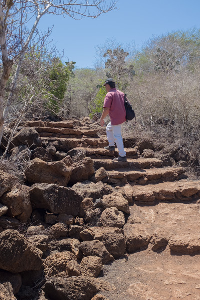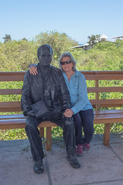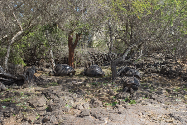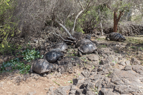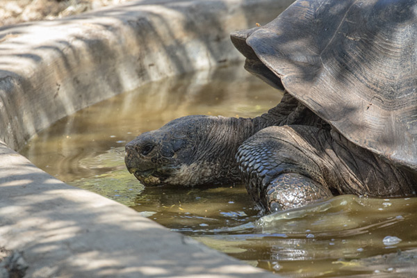 Stimmt, das Schleppen der Ausrüstung und das Herumlaufen und Herumstehen in der Hitze sieht man mir wohl an. Ich beruhige sie und meine, ich sehe immer so aus, wenn etwas anstrengend ist und bedanke mich für die Fürsorge. Hier gibt es edlich eine Bank und Schatten und ich erhole mich ein wenig. Wasser habe ich auch noch genügend mit.Hier sehen wir große und viele Galápagos-Riesenschildkröte (Chelonoidis nigra), die alle von verschiedenen Inseln stammen.