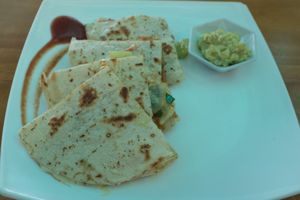Nun brauchten wir eine kleine Pause, wir hatten Hunger und Durst. Es gibt hier viele Möglichkeiten in Porto Ayora, wo ich auch Vegetarisches zu essen bekomme. Ich probierte eine Quesadilla mit Gemüse, Friedrich nahm eine mit Cameron. Sehr lecker!