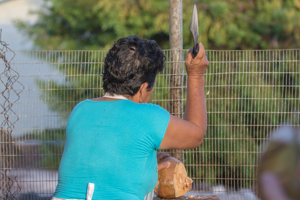 Frische Kokosnüsse gibt es hier. Wir kaufen uns eine und trinken den köstlichen Saft. Dann schlagt sie die Nuss auf und wir essen das Kokosfleisch.