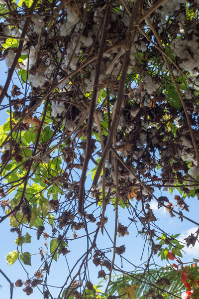 Unter diesem Baumwollbaum (Bild 4) stehen Argentinier und sie zeigen uns die Baumwolle, ob wir wüssten, dass dies Baumwolle sei. Nein, wir wussten es nicht und so flachsen wir (mehr Friedrich) rum. Er könne sich ja ein T-Shirt darausmachen. Ha, ha... wir fragen, woher sie kommen. Ok, aus Argentinien, dann meint "er" (mit der Baumwolle in der Hand) und wir sind aus Deutschland. Verdutzt fragen wir nach, wieso wir so deutsch aussehen?