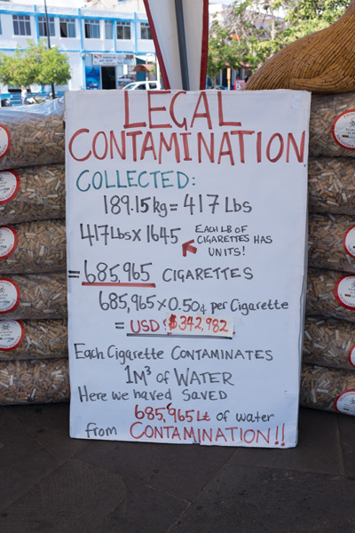 Er sammelt tagtäglich Kippen, die achtlos auf die Straße geworden werden. Hier liegen 189,15 kg von Zigarettenkippen in Säcken, die nun nicht das Wasser verunreinigen. Es wären laut seiner Rechnung ( Bild 4) 685,965 Liter.