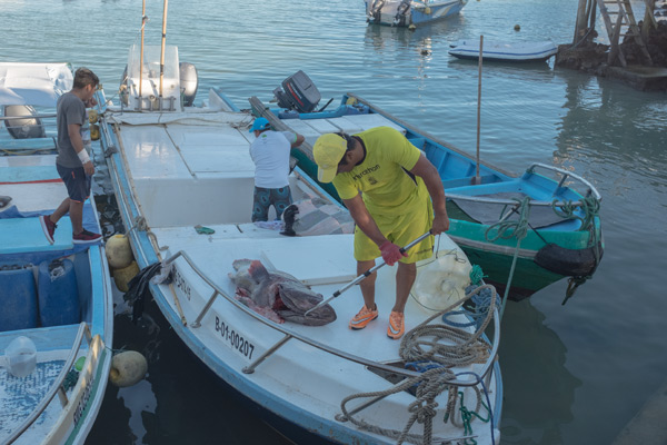 Auf dem Rückweg zum Hotel kommen wir wieder - wie immer - am Fischmarkt vorbei. Dieses Mal werden gerade Fische aus den kleinen Kuttern herausgeholt.
