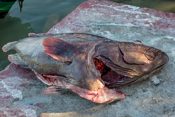 Dieser Riesenzackenbarsch (Mero) bringt 80 kg auf die Waage. Sie haben Mühe ihn nach oben zu hieven.