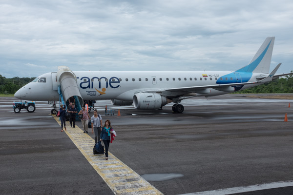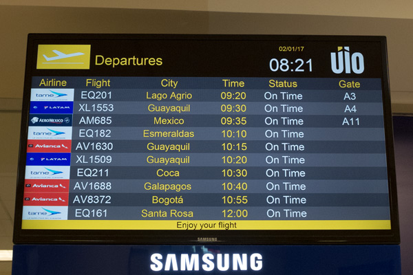 In Quito gingen wir zum Tame-Schalter und gaben die Koffer auf. Ich hatte uns schon am Abend zuvor eingecheckt und wir hatten auch Sitzplätze bekommen. Auch bei Tame interessierte es keinen, wieviel wir im Rucksack hatten, Gott sei Dank! Danach suchten wir uns ein Plätzchen, wo wir frühstücken konnten. Kaffee und Bagel mit Cream Cheese und Marmelade, das war ok, wenn auch viel zu teuer. Hier hatten wir auch noch einmal Internet. Morgens in der Wohnung funktionierte es nämlich nicht.
