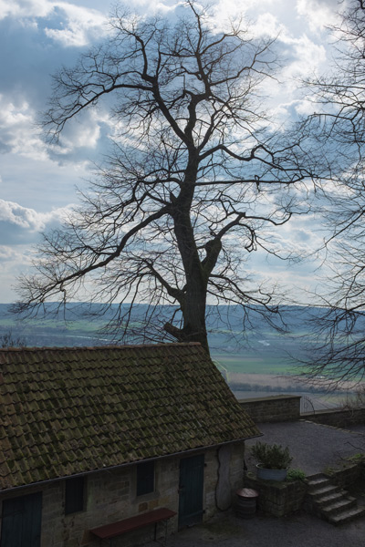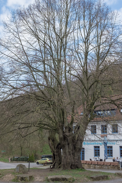 Wir gehen langsam wieder zurück und kehren in die Gaststätte gegenüber der Schaumburg ein. Hier sitzen wir in der Sonne bei einem Radler und Kakao und Blick auf die Burglinde. Die Burglinde ist 600 Jahre alt, hier an diesem Platz wurde Recht gesprochen und vor vielen Jahren im 17. Jh. ein junges Mädchen als Hexe auf dem Scheiterhaufen verbrannt.