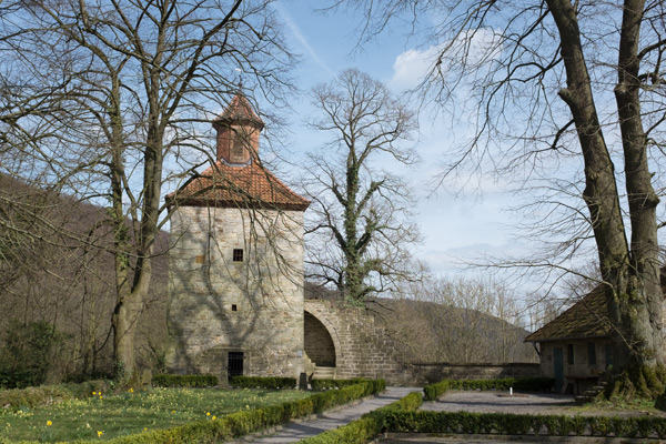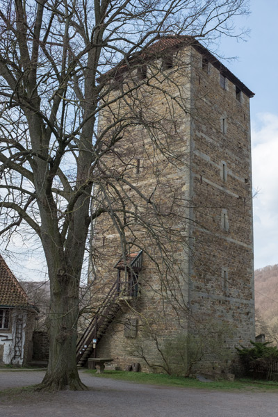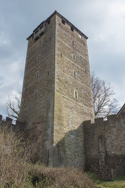 Der Dicke Turm stammt auch aus dem 14. Jahrhundert. Durch ihn ging man früher auf das Burggelände. Man kann ihn besteigen, es sind 100 Stufen bis nach oben. Es wird um eine Spende von 50 Cent gebeten. Ich war schon öfter mal „oben“, aber heute haben wir uns ganz gespart.