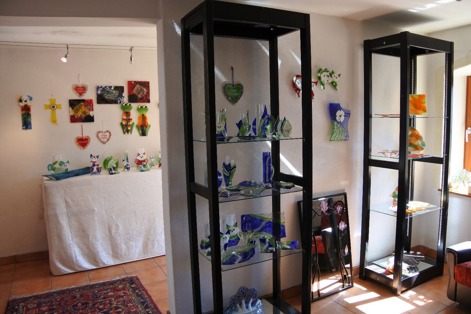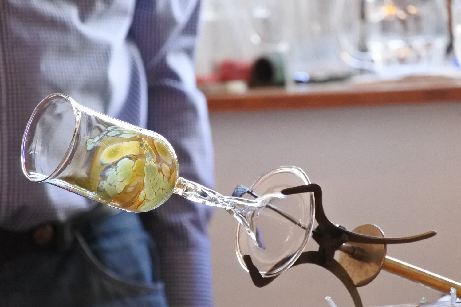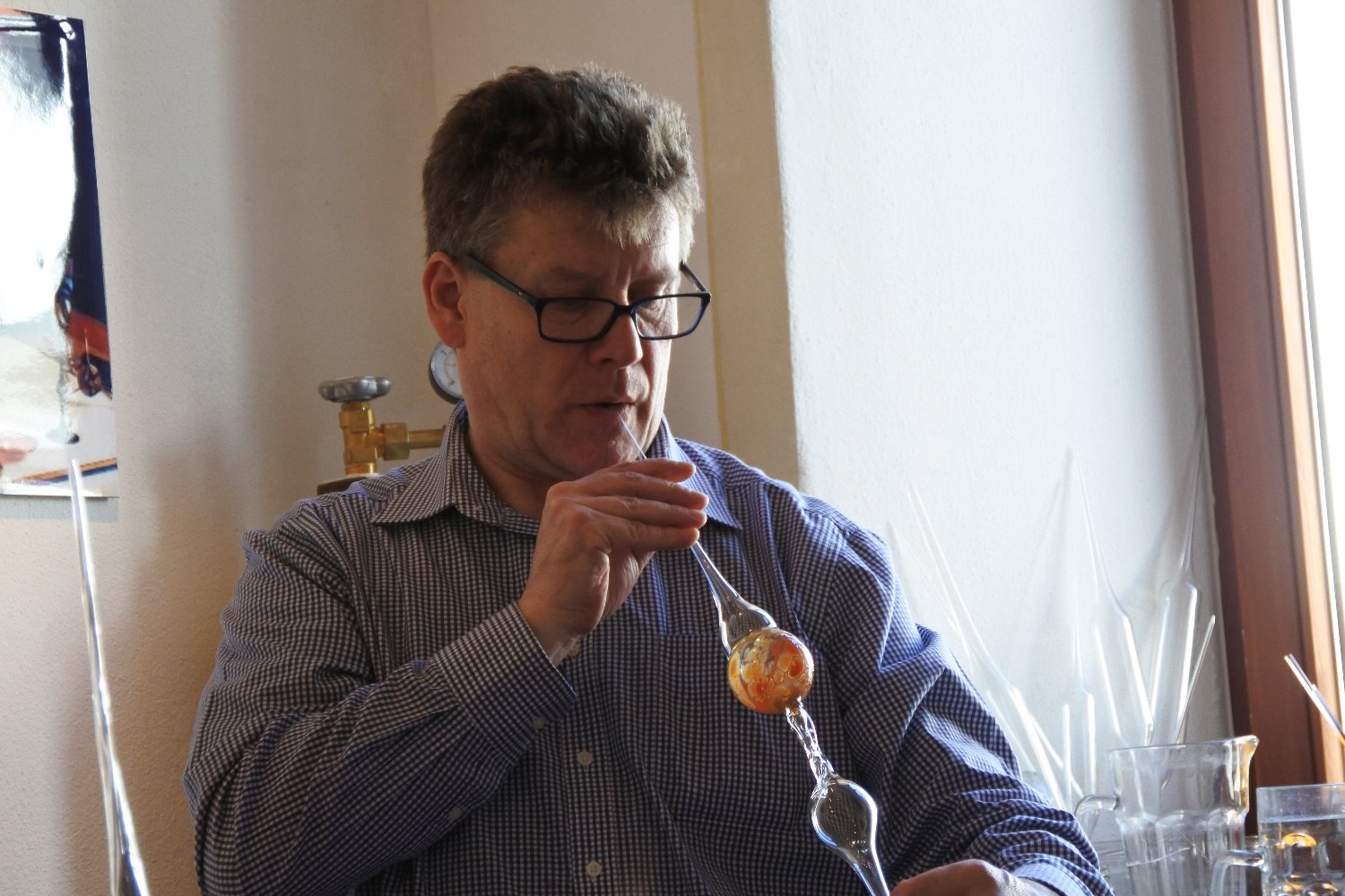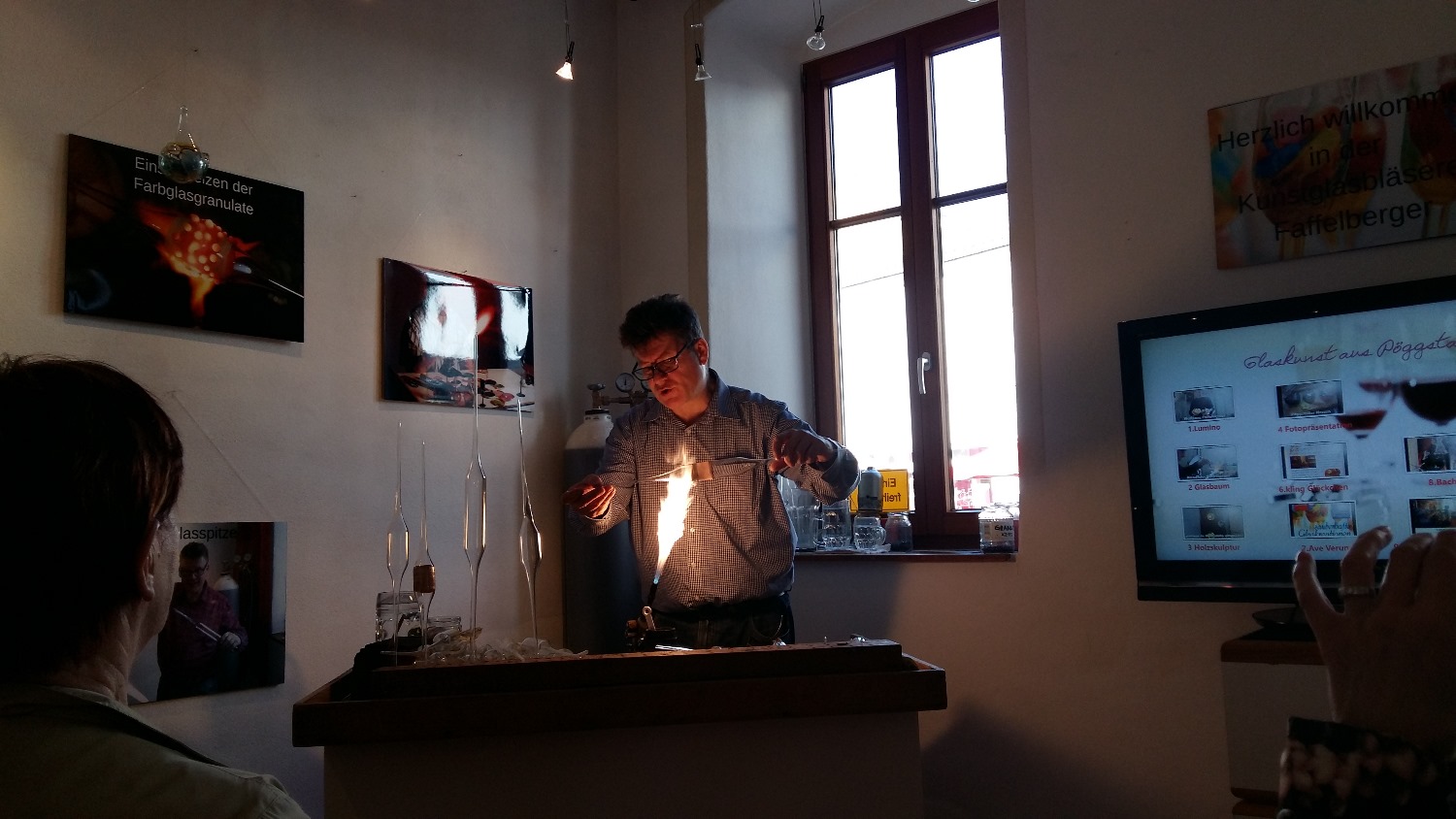 Wir gingen zum fast nebenan liegenden Kunstglasbläser und dem haben wir zu geschaut wie er ein Glas gemacht hat. Der hat in wien studiert, war in Deutschland, dann in Amerika und jetzt hat er im Waldviertel gegenüber vom Schloß seine Werkstatt mit Geschäft und Vorführungsraum.