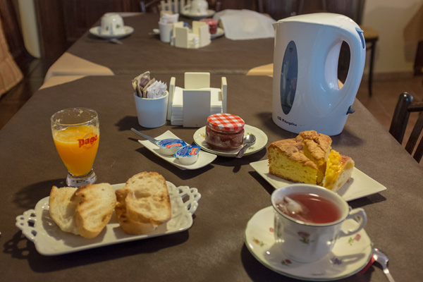 Heute morgrn bin ich erst zu 9 Uhr zum Frühstück gegangen, es gab frisch gepressten Orangensaft, Tee oder Kaffee, Baguette frisch getoastet, Butter, selbst gemachte Marmelade, Käse und dann noch 3 Stücke selbst gebackenen Kuchen.