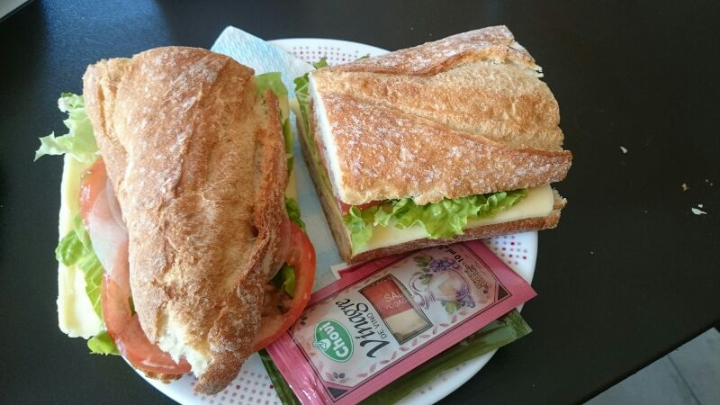 Ja, es war lecker, mhmm Käsesorte ich glaube machmal schmeckt er etwas anders... Ich hatte heute morgen ein Lunchpaket mitbekommen, da ich früher losgegangen bin. Da waren tolle Sachen drin: 1 Banane, 1 Apfelsine, 1 Flasche Wasser und ein Dreifach-Kastenbrot (also ungetoastetes Weißbrot) belegt mit Käse, Tomaten und Salat.
