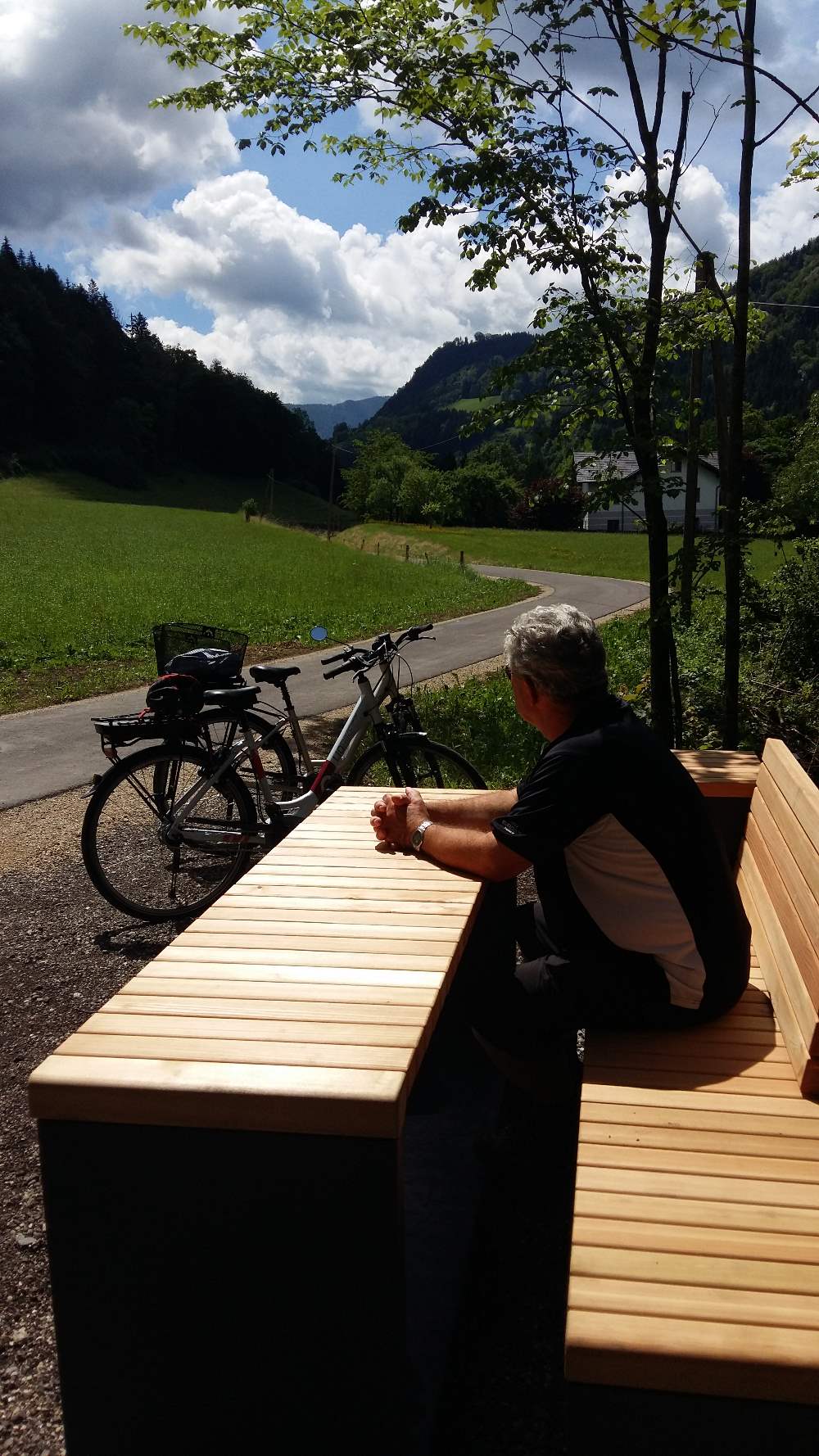 Am neuen Radweg zu uns sind wir wieder heimgeradelt und haben die neue Möbelierung an den Rastplätzen ausprobiert. Nur mehr eine Woche, dann ist grosses Eröffnungsfest.