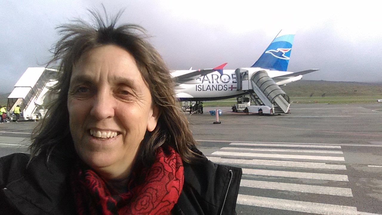 Der Flug Kopenhagen-Färöer geht schnell vorbei, 1 Stunde 50 Minuten. Aus dem Flugzeug laufen wir zum Terminal - ein Blick zurück und ein Foto vom Flieger mit dem Handy und ein Selftie.. wie immer gruselig.
