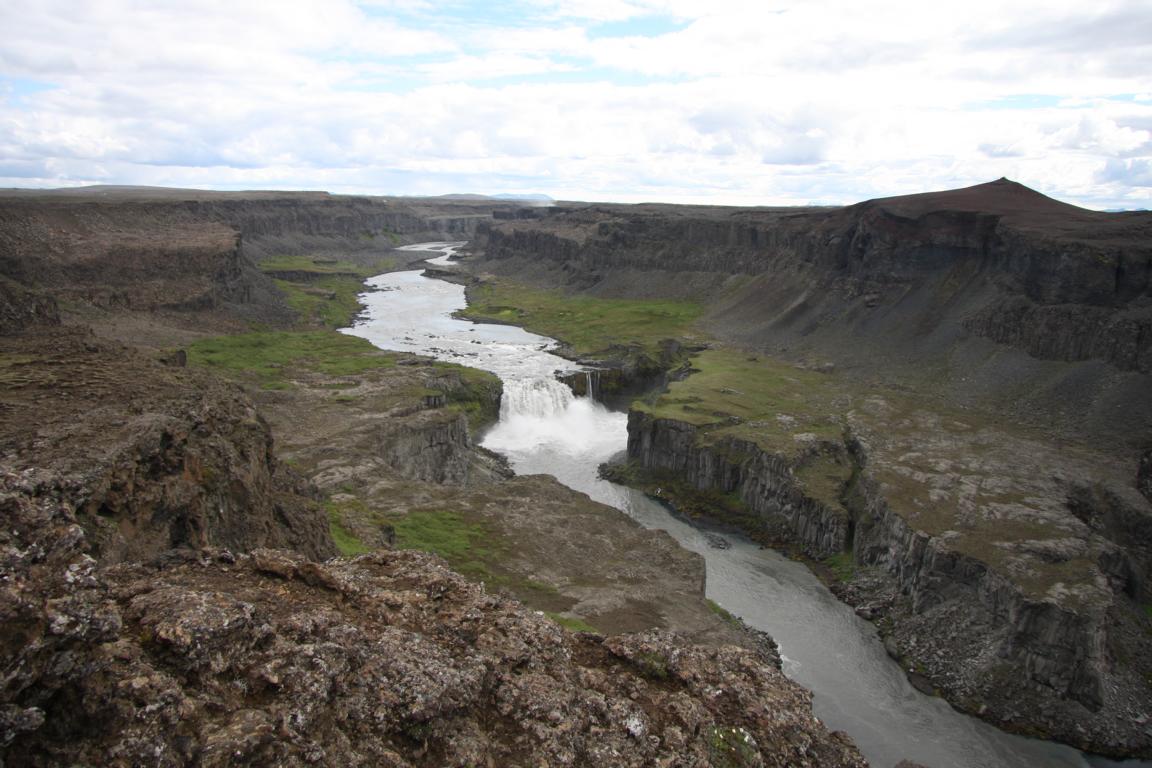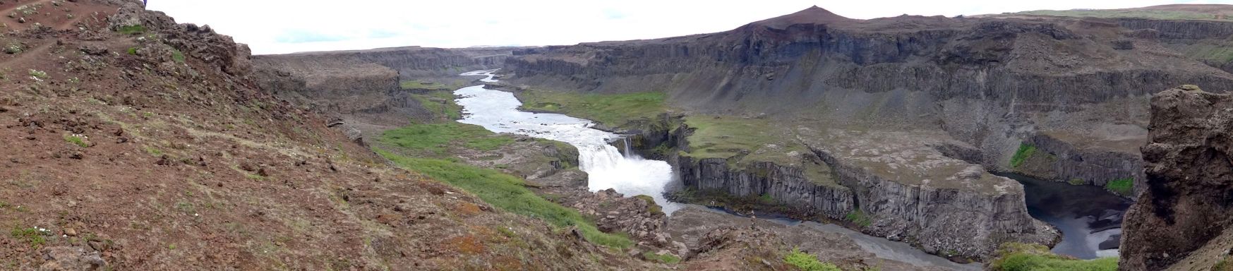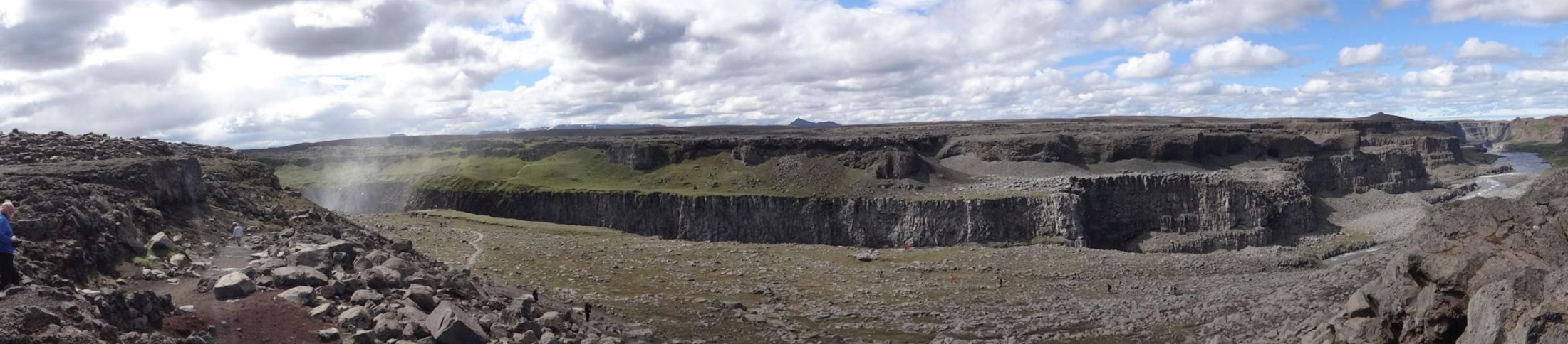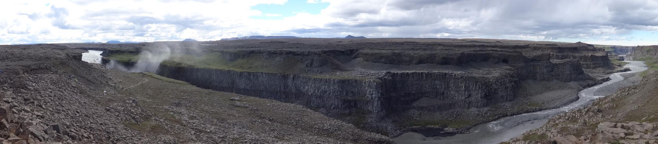 Neben dem Dettifoss gibt es in unmittelbarer Nähe zwei weitere große Wasserfälle. Zum einen der Selfoss, der vor dem Dettifoss liegt und nur per Fuss, 2 km von hier, zu erreichen ist, und den Hafragilsfoss, der hinter dem Dettifoss liegt. Bevor wir mit dem Auto versuchen an den letzteren etwas näher heranzukommen, noch zwei Panoramafotos