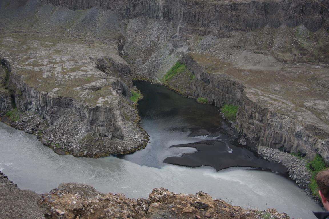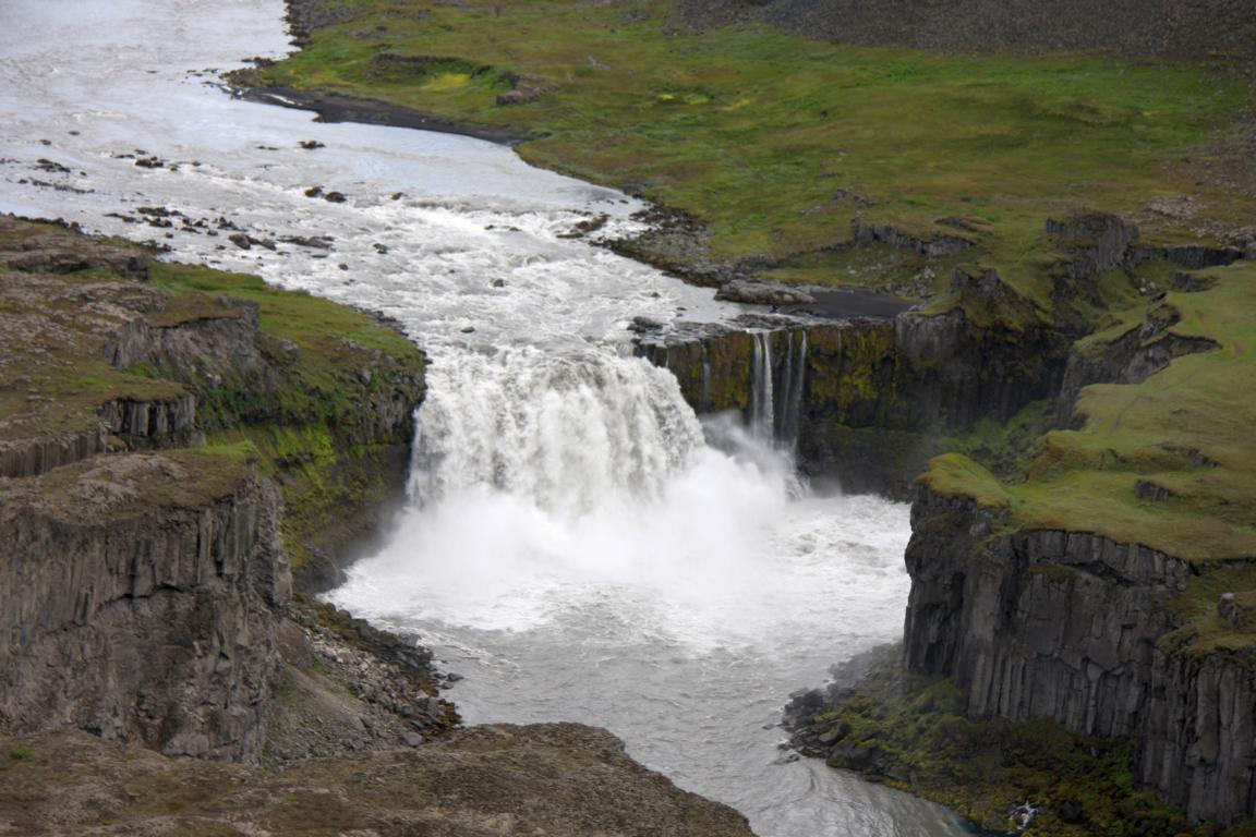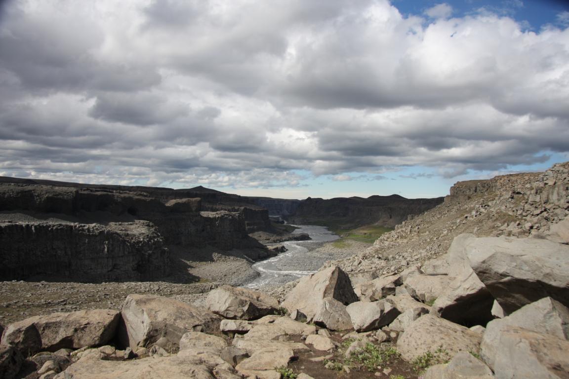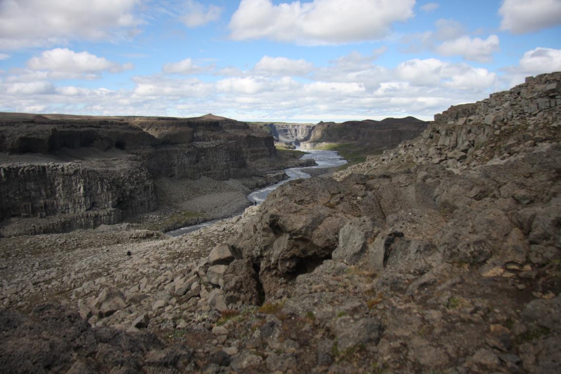 Neben dem Dettifoss gibt es in unmittelbarer Nähe zwei weitere große Wasserfälle. Zum einen der Selfoss, der vor dem Dettifoss liegt und nur per Fuss, 2 km von hier, zu erreichen ist, und den Hafragilsfoss, der hinter dem Dettifoss liegt. Bevor wir mit dem Auto versuchen an den letzteren etwas näher heranzukommen, noch zwei Panoramafotos