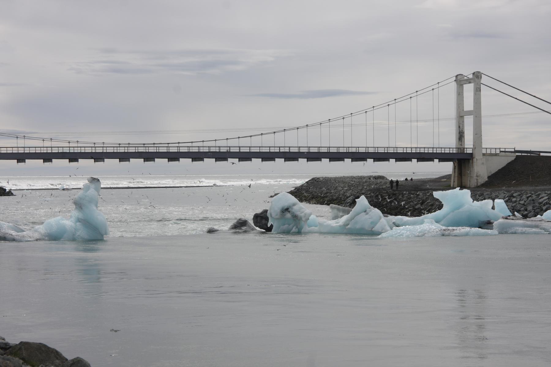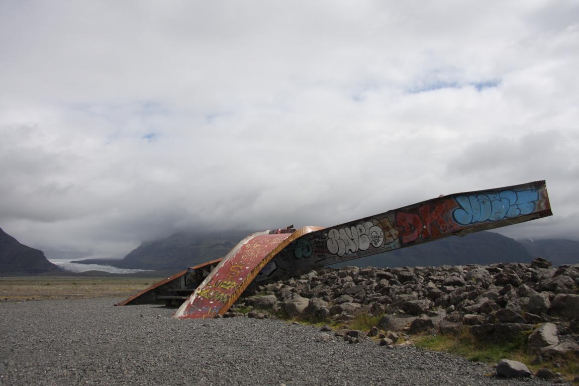 Dann als Denkmal ein Stück Brücke.1996, infolge eines Ausbruchs des Vulkans Vatnajökull kam es zu einem enormen Gletscherfluss und infolges dessen dann stürzten große Wassermassen los und zerstörten dann eben auch die 376 m lange Brücke von Gigiukvisl.