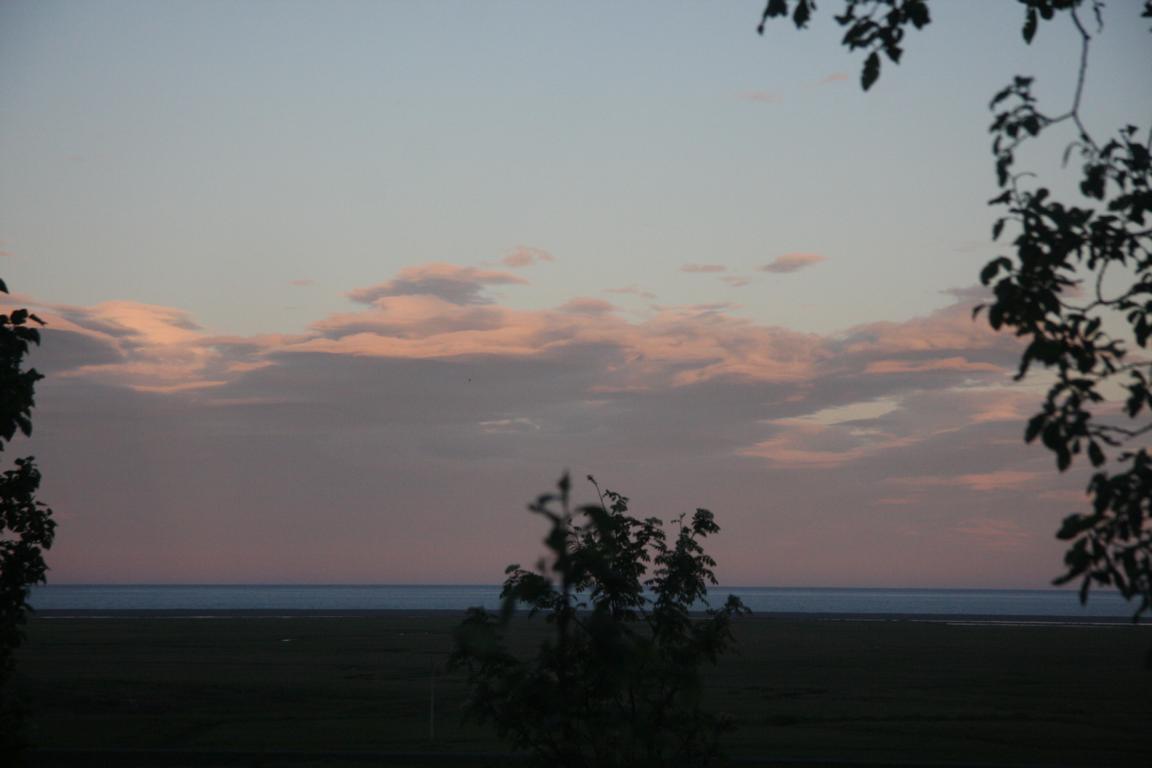Immerhin sieht man von unserem Fenster aus sogar das Meer in der Ferne. Und das erste Mal ein wenig rosa Wolken zum "Sonnenuntergang" -