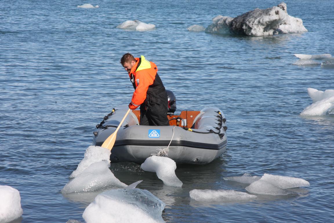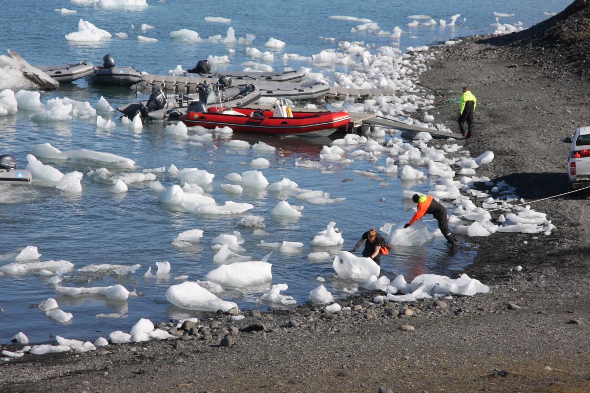 Es ist noch sehr früh und für die Boote wird noch der Weg frei gemacht - hier seht ihr Leute beim Eisberge verschieben