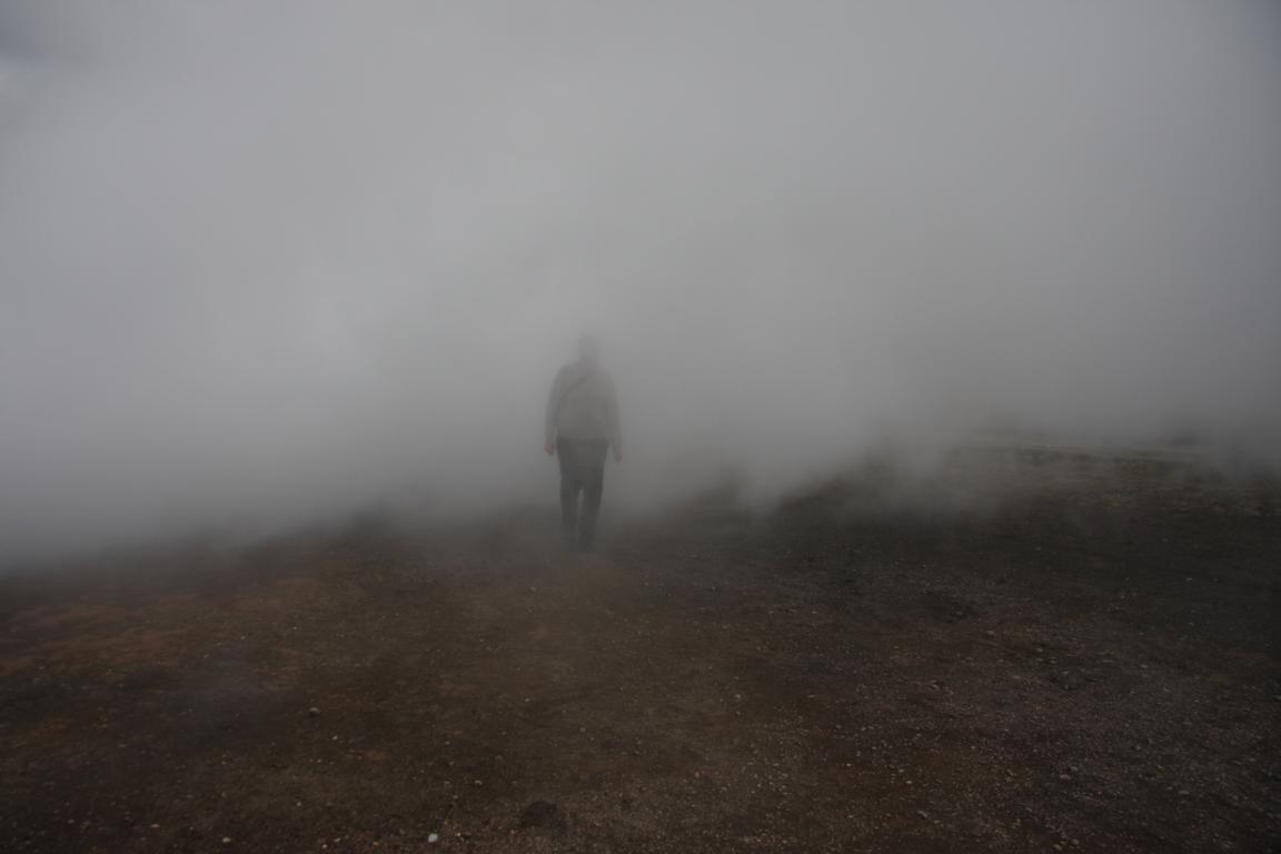 Meine Männer stehen hinter einen Schwefeldampfwand. Der Dampf strömt aus diesem Steinhaufen, neben dem ein Warnhinweisschild steht - leider kann man dieses im Dampf nicht erkennen