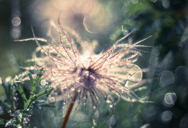 Wie gesagt, es bezieht sich auf den Hintergrund, am besten bei leichtem Gegenlicht. Man muß halt schauen, von welcher Blickrichtung aus das Licht im Hintergrund besonders schön schimmert.Hier mal eine verblühte Küchenschelle, wo ich extra den Hintergrund mit Wasser benetzt habe.