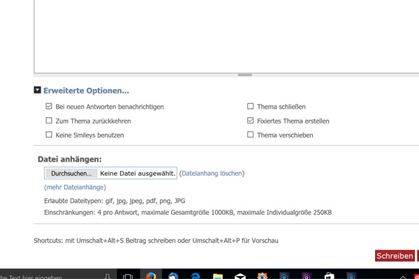 Man klickt auf -> Antworten (Bild 1) schreibt einen kleinen Text, clickt dann auf -> Erweiterte Optionen (Bild 2) und dann auf -> Durchsuchen und zum Schluss auf -> (Schreiben Bild 3)