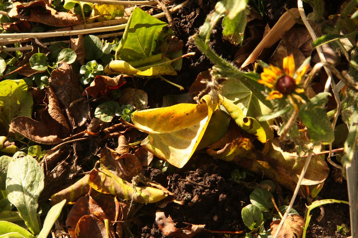 2 große Komposthaufen wurden umgeschichtet. Wir haben viel gute Erde gewonnen. Das Gemüsebeet wurde vergrößert, ebenso eine Rabatte, wo dann im nächsten Jahr mehr Buntes angepflanzt wird. Dort wurde die neue Erde gleich aufgetragen. Es sieht schon ein wenig traurig aus. Von der Pracht ist kaum etwas übriggeblieben.