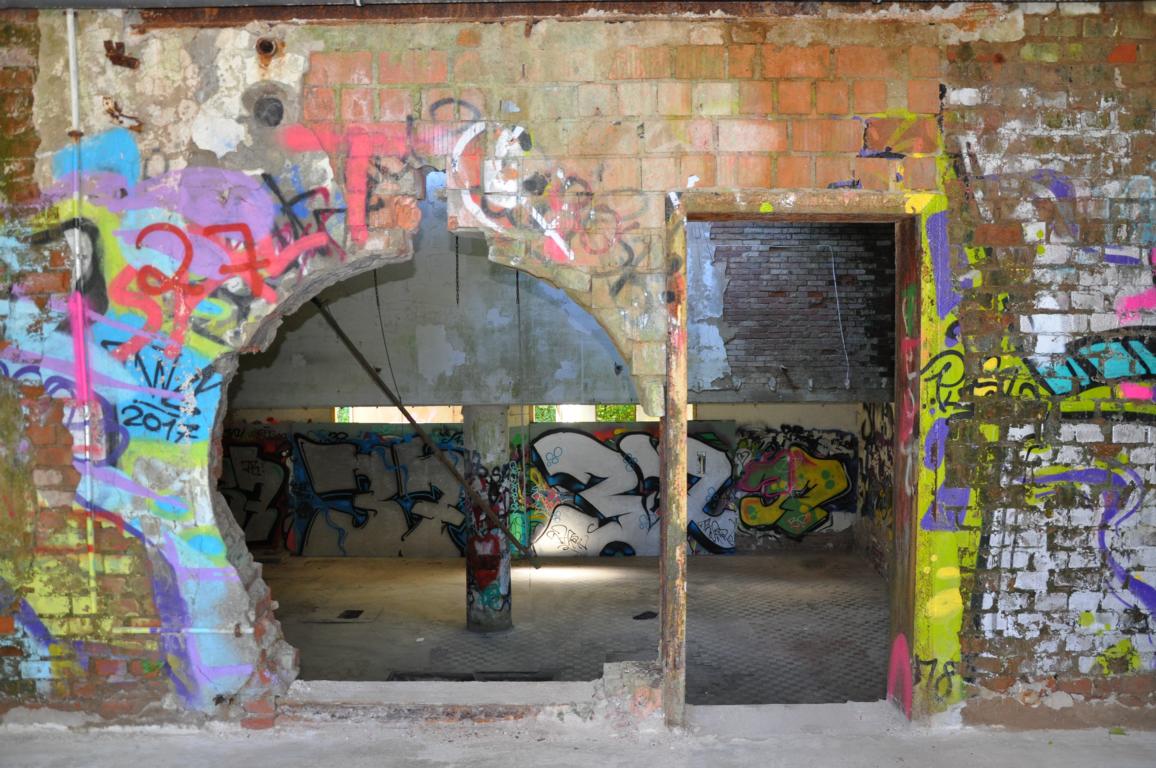 Irgendwie sieht es so aus, als würde der Ruine tatsächlich in Kürze der Garaus gemacht: Das Grundstück ist ziemlich gerodet worden und auch innen in der großen Halle liegen viele Säcke mit Schutt.