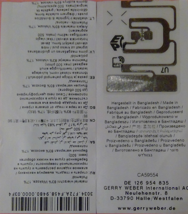 Was für Gerry Weber spricht, es steht noch ein Vermerk auf der Waschanleitung: Remove RFID Chip before wearing. Andere Firmen lassen die Entfernung nicht zu.