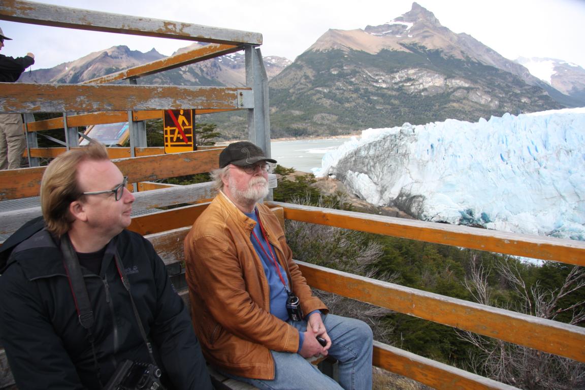 • Noch hat es sich nicht ausgegletschert. Wir sitzen in der Sonne auf einem der Balkone und warten auf einen größeren Abbruch. Aber es will einfach nichts Größeres abbrechen.
