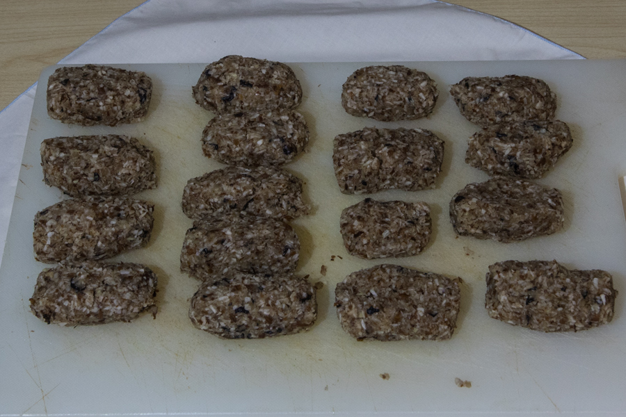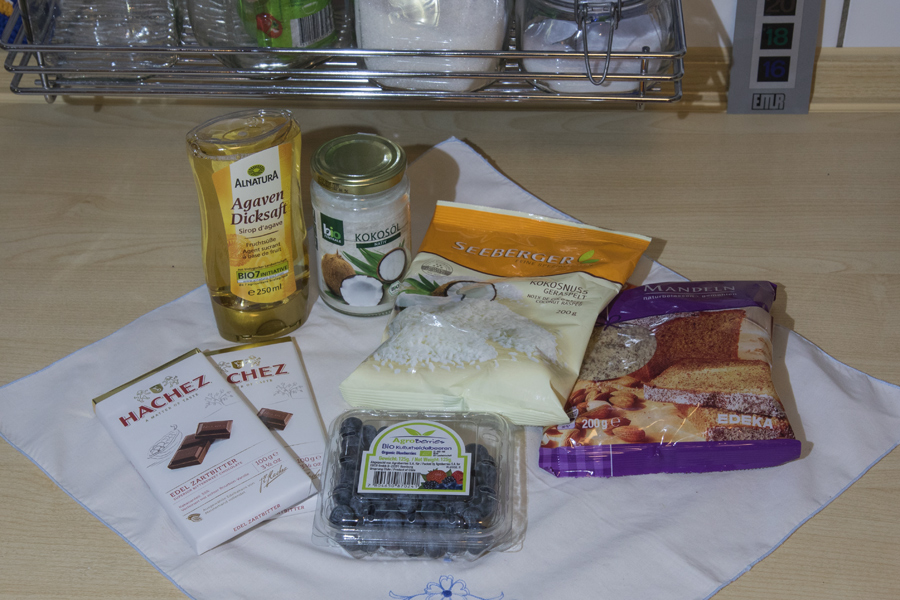 Das Rezept war recht einfach, man braucht nur wenige Zutaten wie Mandeln, Kokosraspel, Kokosöl, Agavendicksaft, Heidelbeeren und Zartbitterschokolade, sowie ein paar Holzstäbchen.