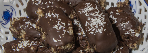Schnell hat man alles zusammengerührt, nur der Schokoladenüberzug, der hat es in sich. Bei mir sind nämlich die kleinen Riegel manchmal in die geschmolzenen Schokolade gefallen und zwar in etliche Einzelteile. Das erzeugte dann etwas Stress. ![]()