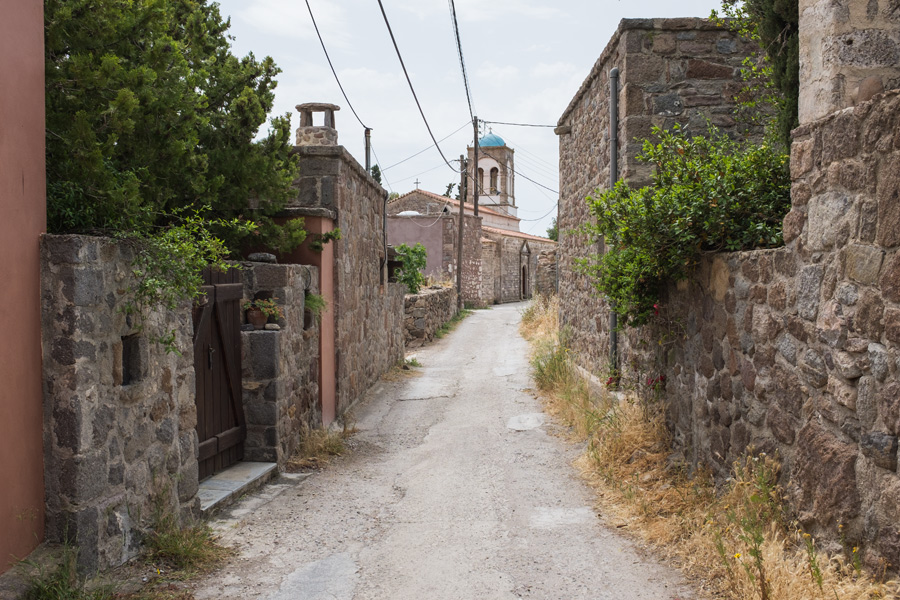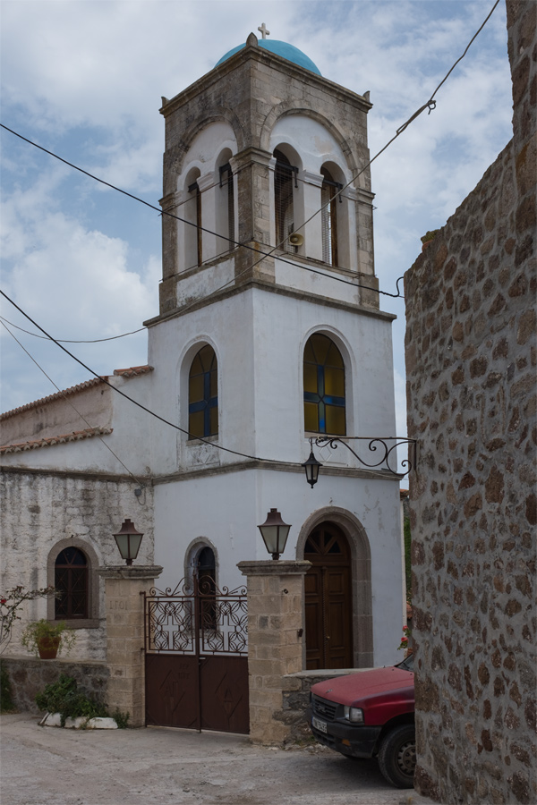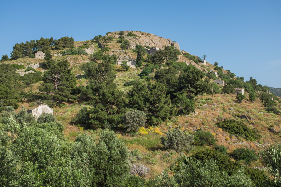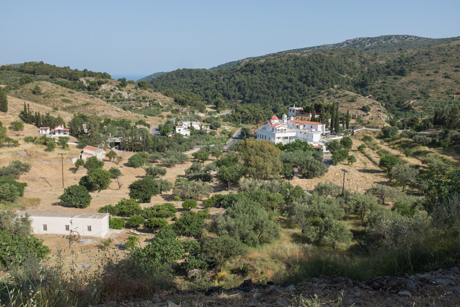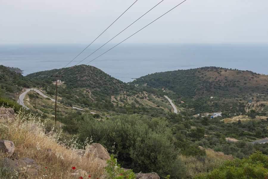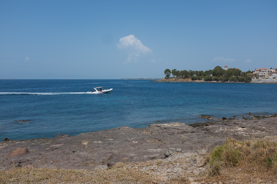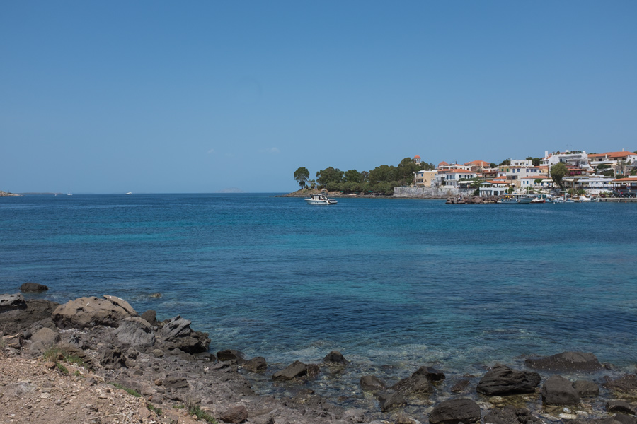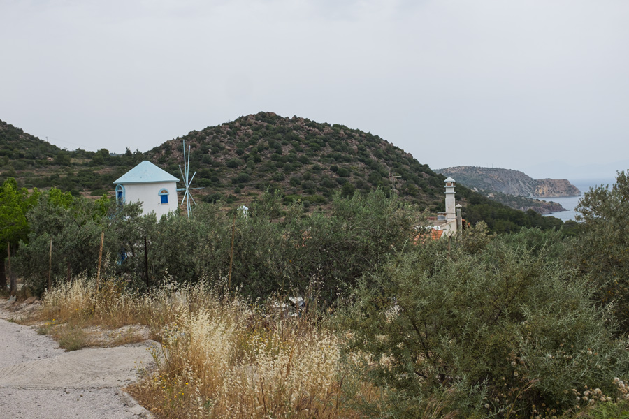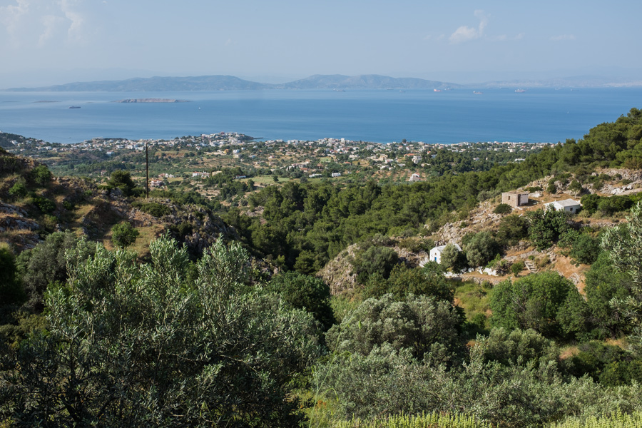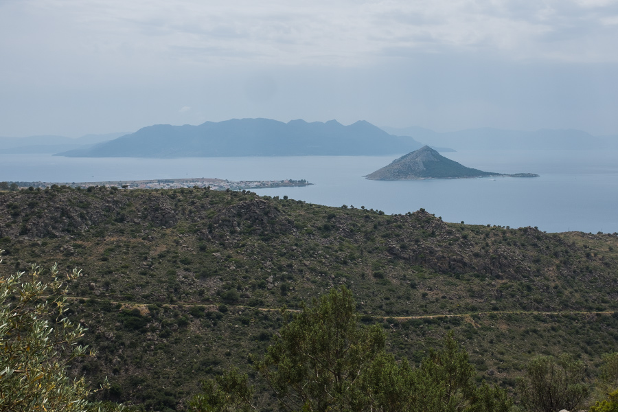 Wir laufen durch das Dorf, man könnte von hier aus auf einem Wanderweg sogar bis zur Küste gehen. Das ist uns jedoch zu weit, wir müssen ja wieder zu unseren Scootern zurück, die wir am Ortseingang haben stehen gelassen. So genießen wir den Blick auf Perdika, die Insel Moni und ganz in der Ferne sieht man sogar den Peleponnes. (Bild 3)