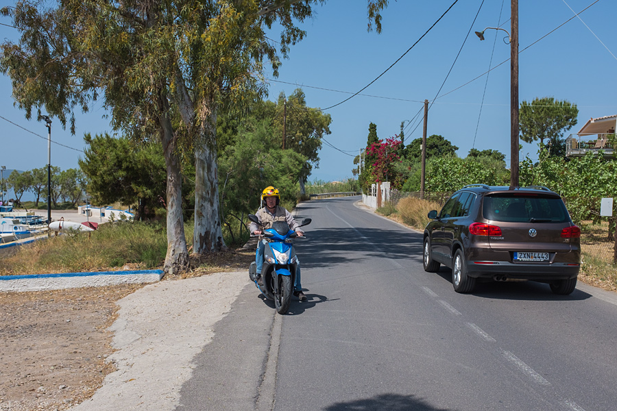 Nun wird es Zeit, wir fahren zurück, stellen die Moped ab, machen eine kleine Siesta und danach frisch geduscht, geht es aufs Sträßchen. An dem Abend laufen wir zu Kostas und treffen uns dort mit Elli zum Abendessen. Es gibt griechische Kost und leckeren Bio-Wein, selbst gekeltert!