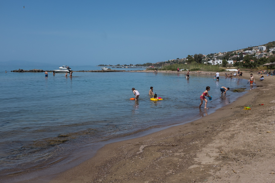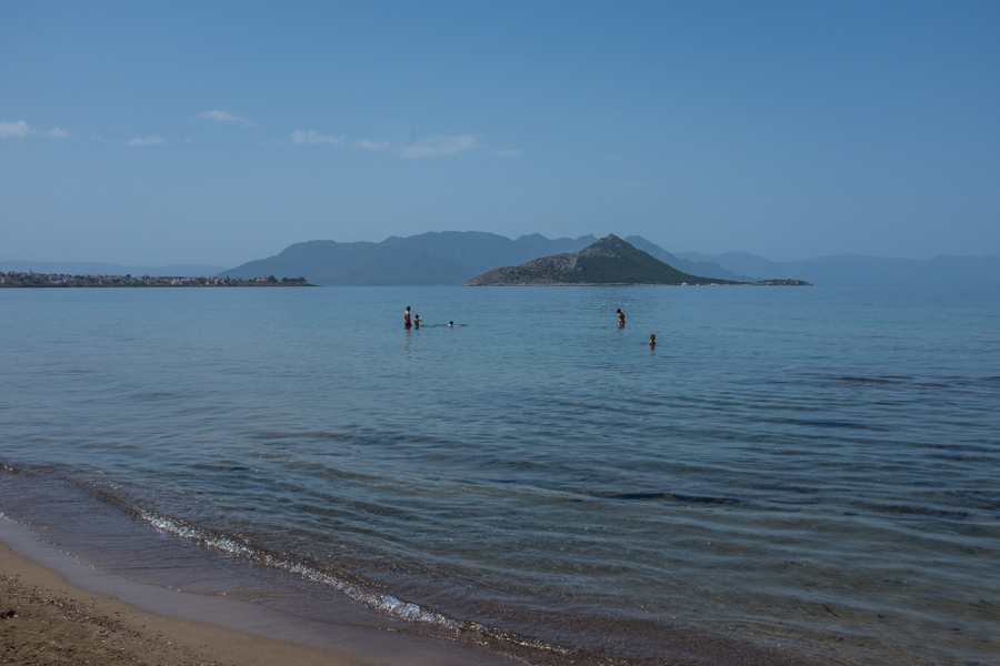Auch in Griechenland ist der 1. Mai der Tag der Arbeit und arbeitsfrei. Im Wasser und am Strand tummeln sich Familien mit Kindern, Urlauber und Einheimische.