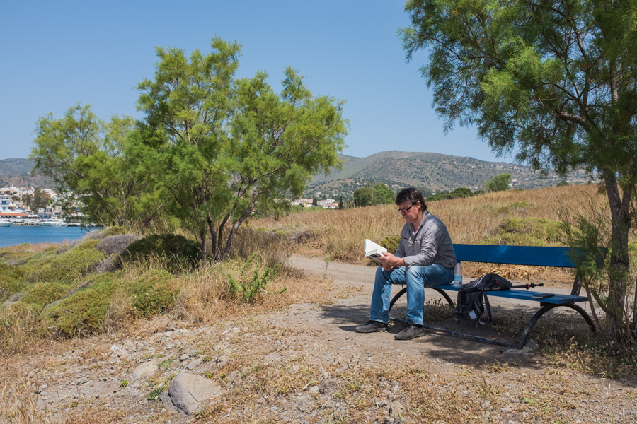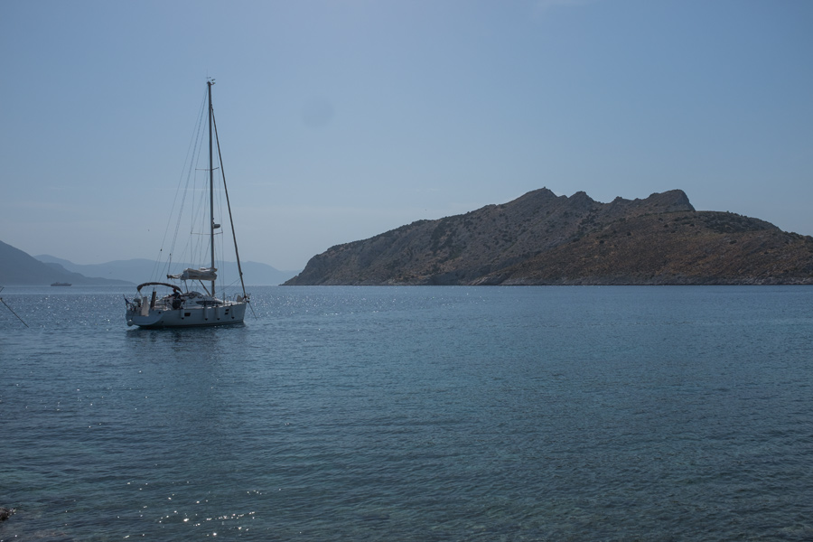 Der Hafen ist voll von Segelschiffen und Yachten, ebenso gibt es kaum noch freie Tische in den Tavernen. Schön für die Griechen. Pappsatt verlassen wir Perdika, werfen noch einmal einen Blick auf die Insel Moni (Bild 5)