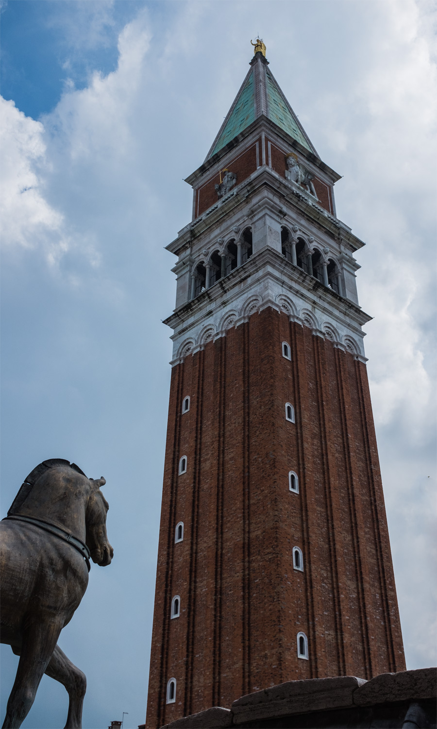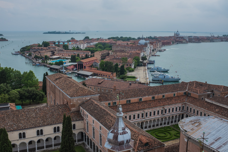 Die Insel ist nur 490 x 360 m groß. Darauf steht das Benediktinerkloster und die Kirche. Da die Kirhe nur bis 19 Uhr geöffnet hat, gehen wir gleich in Richtung Turm. Ich hatte nämlich gelesen, dass man vom Turm aus eine schöne Sicht auf San Marco haben soll. Die Fahrt mit dem Fahrstuhl nach oben kostete 5 oder 8 Euro, ich habe es vergessen.
