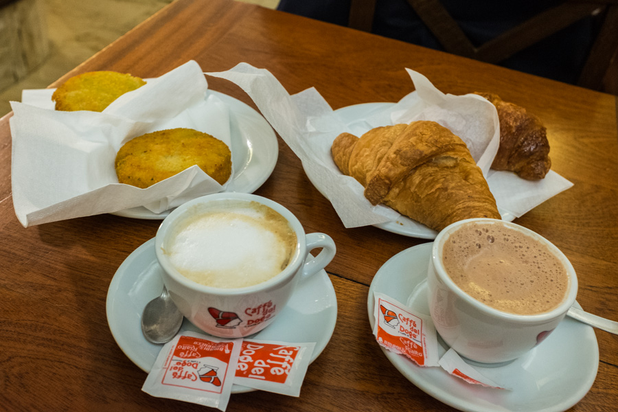 Wir hatten ja noch nicht gefrühstückt! Also suchten wir uns eine kleine "Bar". Da die meisten Toasts schon fertig waren und alle mit Schinken oder so, war es mal wieder nicht so einfach, sie waren aber sehr bemüht, etwas für uns zu finden und zeigten mir eine Art Kartoffelpatty mit Gemüse, also wie ein Veggieburger, nur eben ohne Brot und Beilagen. Klar das nehmen wir und dann sah ich noch Croissants, die bestellten wir dann auch. Dazu einen Cappuccino für mich und für Jenni eine heiße Schokolade, perfekt! Für das alles bezahlten wir 15 Euro. Geht doch