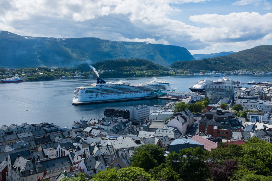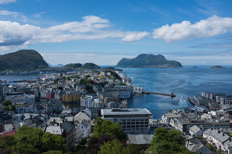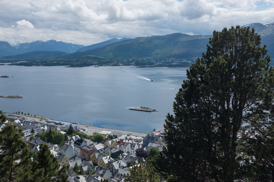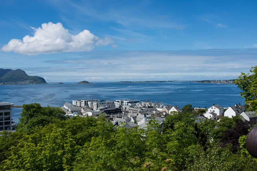 In Ålesund fahre ich erst einmal durch die Altstadt und drehe dann um und suche mir einen Parkplatz in der Nähe des Stadtparks. Vo dort gibt es einen Fußweg mit 418 Stufen hinauf auf den Hausberg. In Ålesund herrscht buntes Treiben, auch auf dem Weg nach oben sind jede Menge Touristen unterwegs. Amerikaner, Japaner, Koreaner, die sind mit Kreuzfahtschiffen angekommen und schwärmen nun aus.