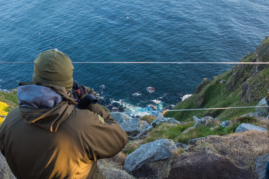 Je nachdem wie viele auf dem Felsen sind, wird es schon mal eng und die besten Plätze sind nun mal direkt vor dem "Abgrund". Noch vor acht waren da und ja, es war vereinzelnt schon mal ein Papageientaucher zu sehen. So richtig los ging es aber erst nach 21 Uhr.