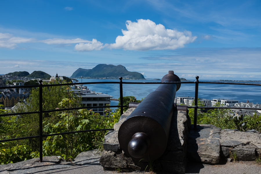 In Ålesund fahre ich erst einmal durch die Altstadt und drehe dann um und suche mir einen Parkplatz in der Nähe des Stadtparks. Vo dort gibt es einen Fußweg mit 418 Stufen hinauf auf den Hausberg. In Ålesund herrscht buntes Treiben, auch auf dem Weg nach oben sind jede Menge Touristen unterwegs. Amerikaner, Japaner, Koreaner, die sind mit Kreuzfahtschiffen angekommen und schwärmen nun aus.
