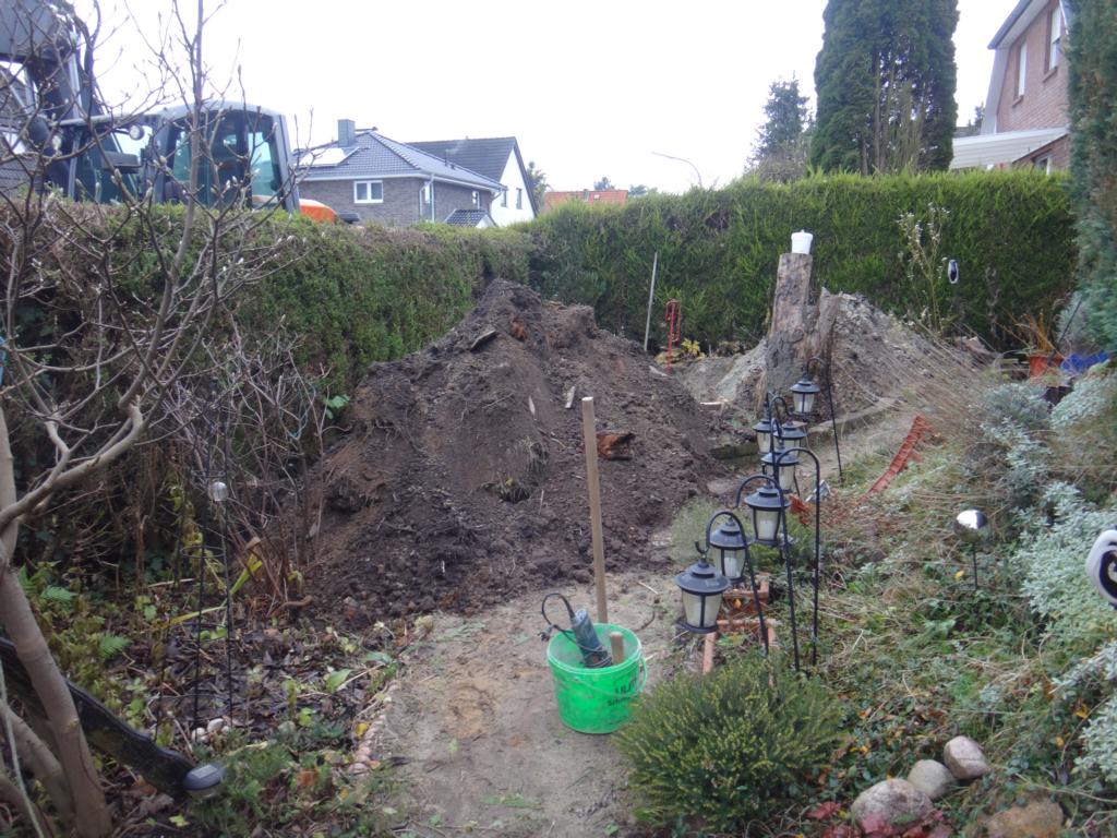 Der vordere Sandberg verschwand später noch, weil mit ihm verfüllt wurde - aber der hintere und jede Mange Steinbruch blieben liegen... Der Handwerker hatte vergessen den Container zu bestellen, um das alles abfahren zu lassen. So blieben wir quasi drauf sitzen...