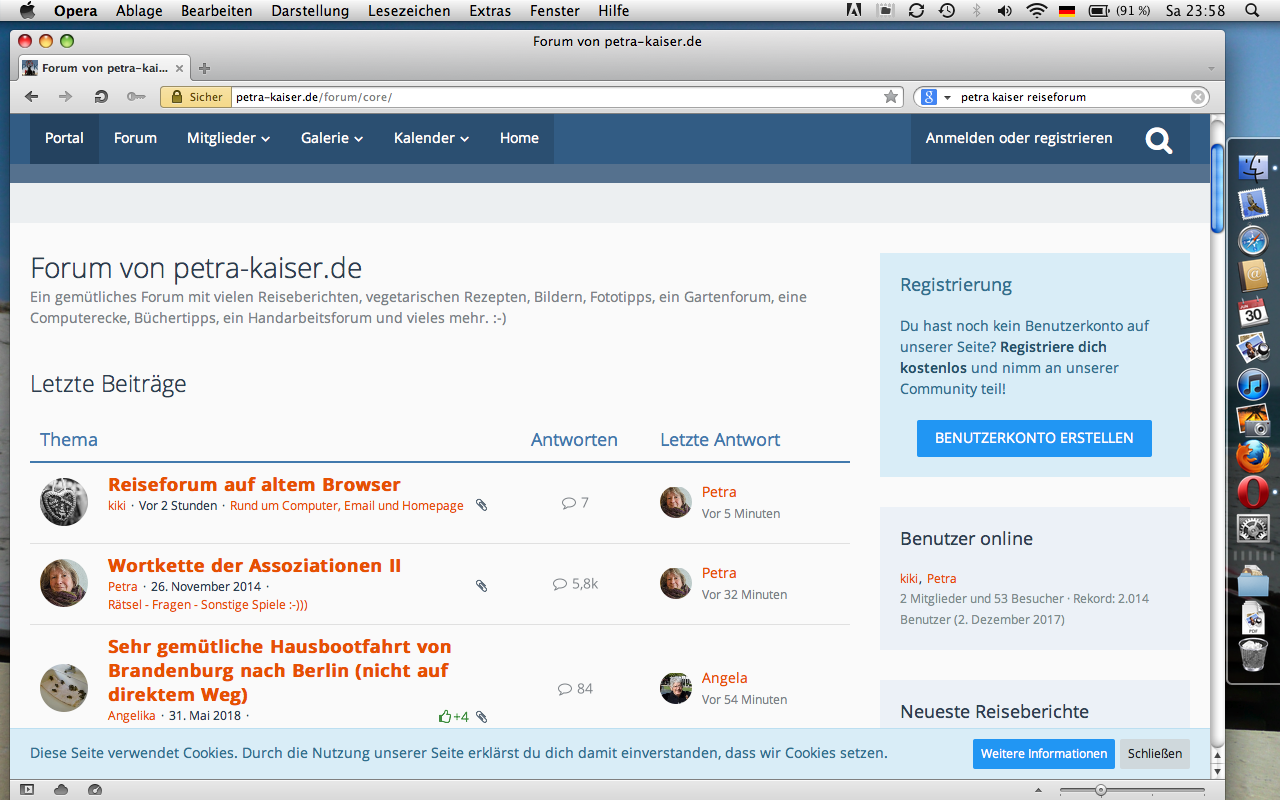 Mein uraltes MacBook tut unermüdlich seinen Dienst. Ich benutze es selten, aber wenn ich auf dem iMac Fernsehen gucke schmeiß ich es gerne nebenbei mal an. In der Regel ist es kein Problem, nur mit dem hiesigen Reiseforum gibt es ein Problem mit der Ansicht und ich weiß nicht, ob da noch was zu retten ist. Gibt es einen alternativen Browser der so alte Betriebssysteme noch unterstützt oder kann man da mit Boardmitteln was ändern. Wahrscheinlich stehe ich hier als Apfelnutzer ein wenig verloren da, aber vielleicht hat jemand einen rat für mich.