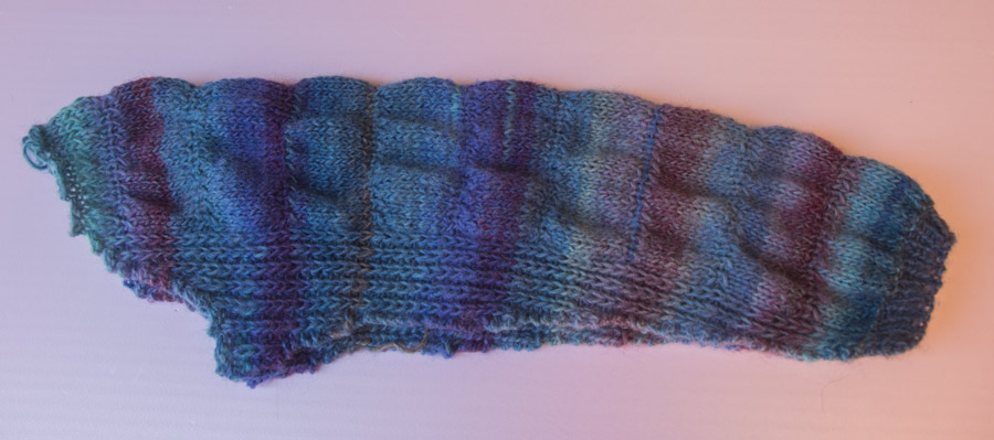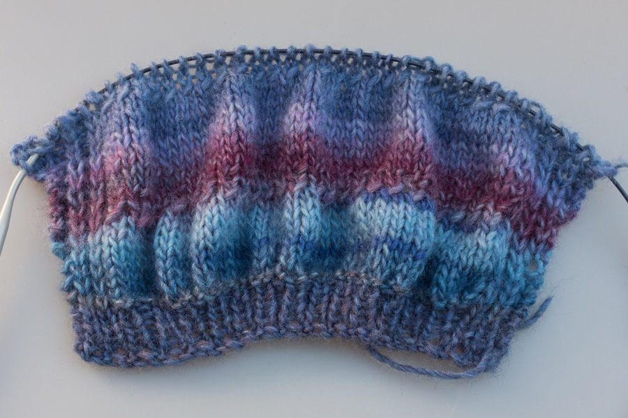 Die Ärmel von meinem Pullover, den ich gerade stricke, werden teilweise im Wellenmuster gestrickt.