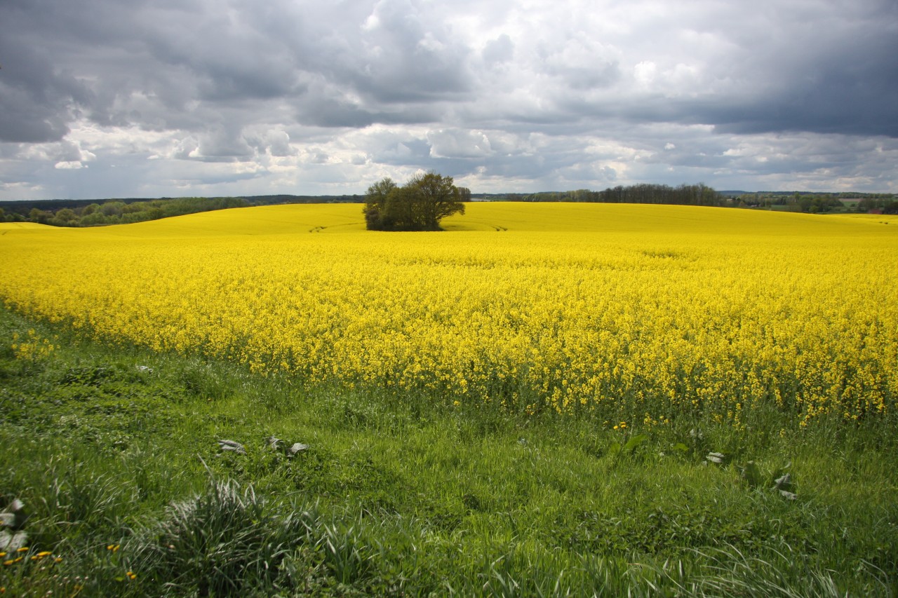 Ein wolkenverhangener Himmel und unten das blühende Rapsfeld........einfach nur schön
