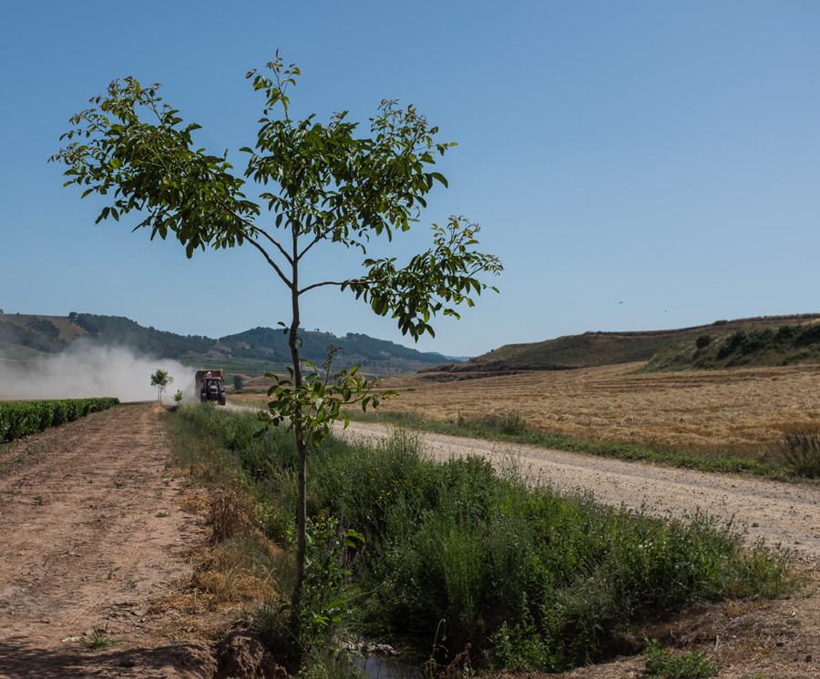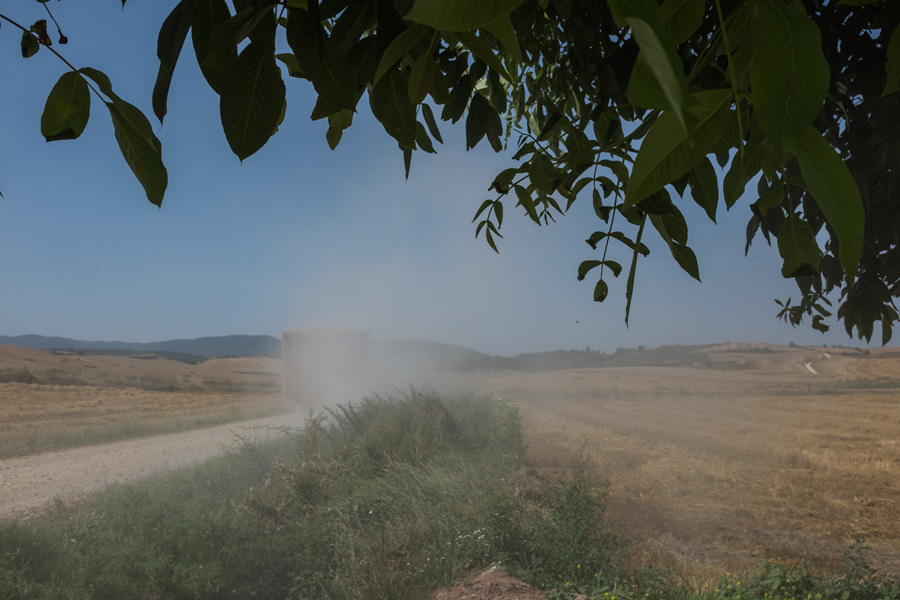 Es gibt einen einzigen Baum auf dieser Strecke, der etwas Schatten spendet. Dort ließ ich mich auf den Boden fallen und verschnaufte. Ab und zu bretterte ein Traktor vorbei, dann wurde man in eine Staubwolke eingehüllt!