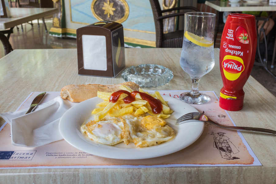 Nach einer Weile kommt er dann doch mit der Flasche an und zeigt mir die Zutatenliste und redet immer wieder malo, malo und Chemie. Ich haue mir dann also richtig viel malo Ketchup auf die Pommes und genieße sie.