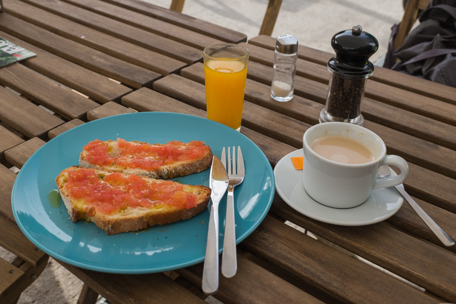 Jetzt habe ich doch ein paar Sachen vergessen. Die erste Pause machte ich nach 6 km in Grañón. Ich bekomme frisch getoastetes Brot mit einem Tomatenbelag und Olivenöl, sehr lecker. Dazu trinke ich einen Orangensaft, auch frisch gepresst und einen Café con leche.